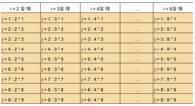 위의 이중 루프 실행 구조를 표로 나타내 보면 다음과 같다. 보통 중첩 반복문을 사용할 때는 삼중 루프 이상의 구조는 사용하지 않는다.