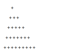 이중 for 루프를 이용하여 만들 두 번째 패턴은 다음과 같다. 다음 패턴은 문자 '+'이 줄을 바꿀 때마다 1, 3, 5, 7, 9번 반복되는 규칙을 갖고 있다. 이러한 규칙의 패턴을 작은 기능으로 전체 기능을 구현하는 방법인 상향식(bottom up) 문제 풀이 기법을 통해 풀어보겠다.